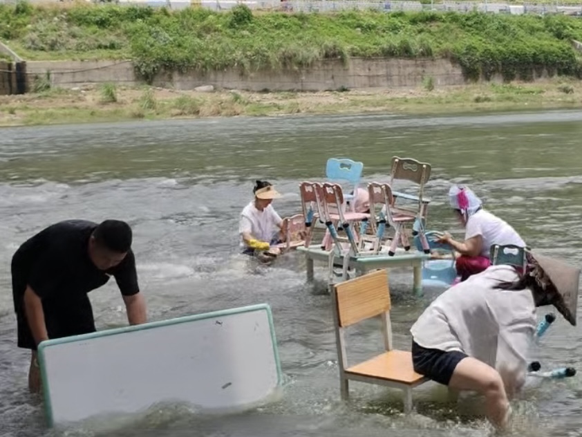 洪水过后,孩子们和大人一起清洗桌椅,收拾屋子,共同建立起自己的小乐园
